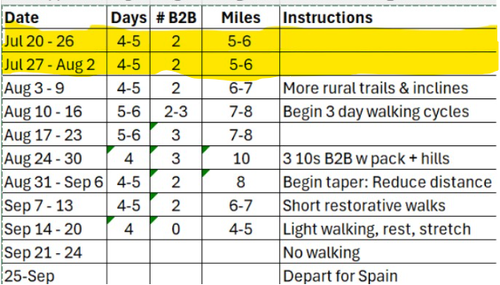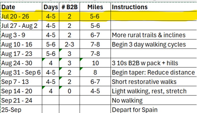 This is the training plan created by ChatGBT. I defined my age, how far I was currently walking, and that my goal was to walk three 10-mile days back-to-back in hills with my pack before leaving on Sep 25.