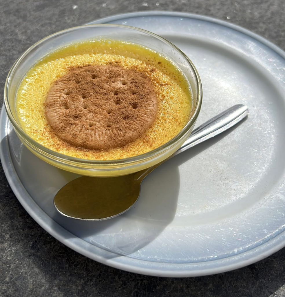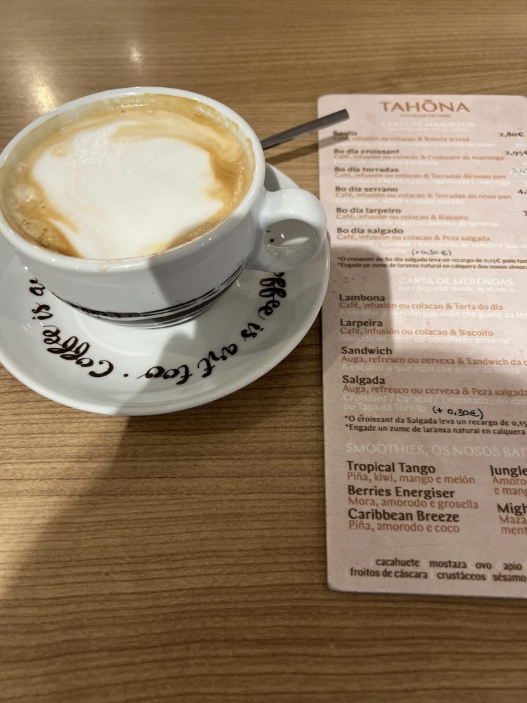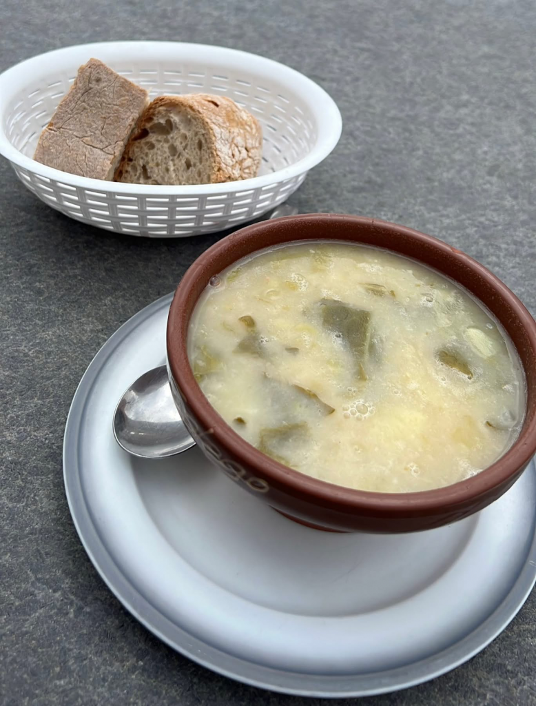 On today’s menu: First course – Galician soup or pasta salad Second course – Chicken or pork Third course – Dessert: ice cream bar, yogurt, custard, and something else I’ve forgotten. Bread and French fries – everywhere and always. Price – €10 (about $11.70) I chose Galician soup (potatoes, white beans) Chicken (baked to perfection) Custard (yum! With a sprinkle of nutmeg)