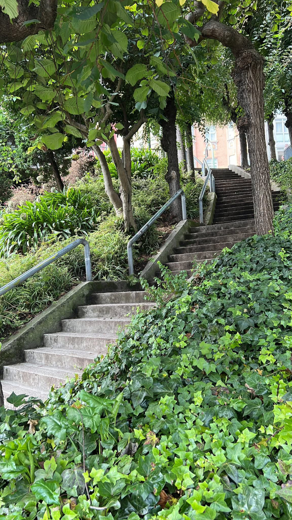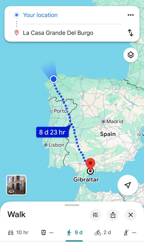 Day One in Spain. Settled into my A Coruña room and pulled up Google maps to see how far I’d be walking tomorrow. It’s a tiny jet lag walk. It showed eight walking days to my next stay. Instead of booking in O Burgo (6 Km away), I’d booked in del Burgo. Quite the scramble to find a room, contact the bag transfer service, and communicate with the del Burgo pensión. I’m the blue
