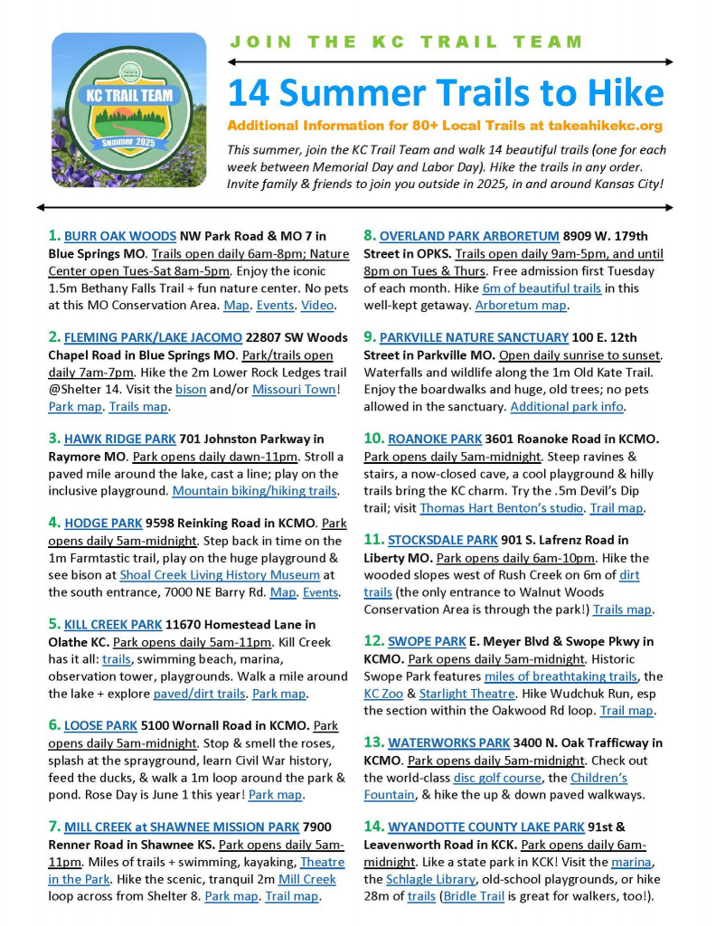 Lake Vista Trail, Lees SummitLine Creek Trail, RiversideMKT Trail, ColumbiaKaty Trail