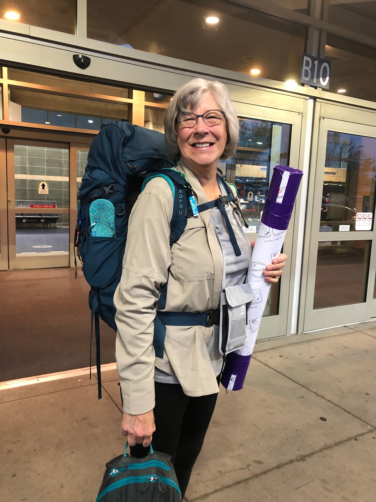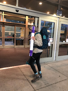 For New York, then a red eye flight to Paris, and all points beyond. In the tube are hiking poles and sharp things that need to be checked. Everything else is carry on luggage.