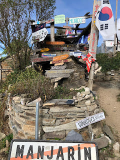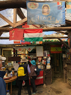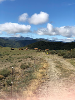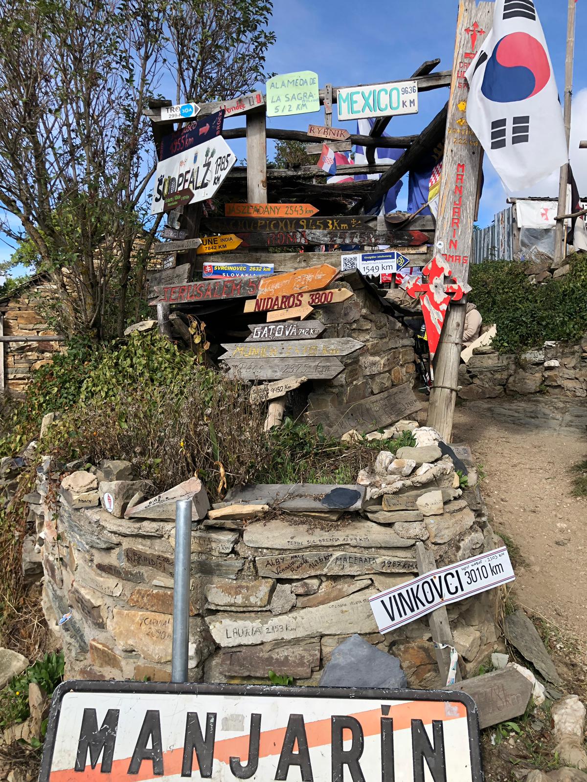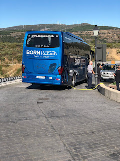 I wasn’t certain I was on the right road, so when I saw a big, fancy tour bus turn into a big, fancy resort-looking place, I decided to ask the bus driver. Turned out he only spoke German, but the tour leader helped me. He’s 74 and has walked the Camino Frances seven times. He was concerned for me -Steep, narrow highway, and offered a ride on their bus. I accepted, and as I watched the road on the way down, I knew it was the right decision.